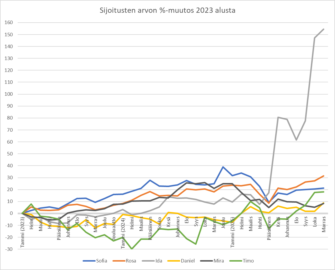 Vuoden lopussa kuopuksen sijoituksen arvo nousi 16 prosenttia plussalle. Ihan vuoden lopussa kaikkiaan neljän osallistujan sijoitukset olivat plussalla – miinukselle jäivät perheemme miehet.