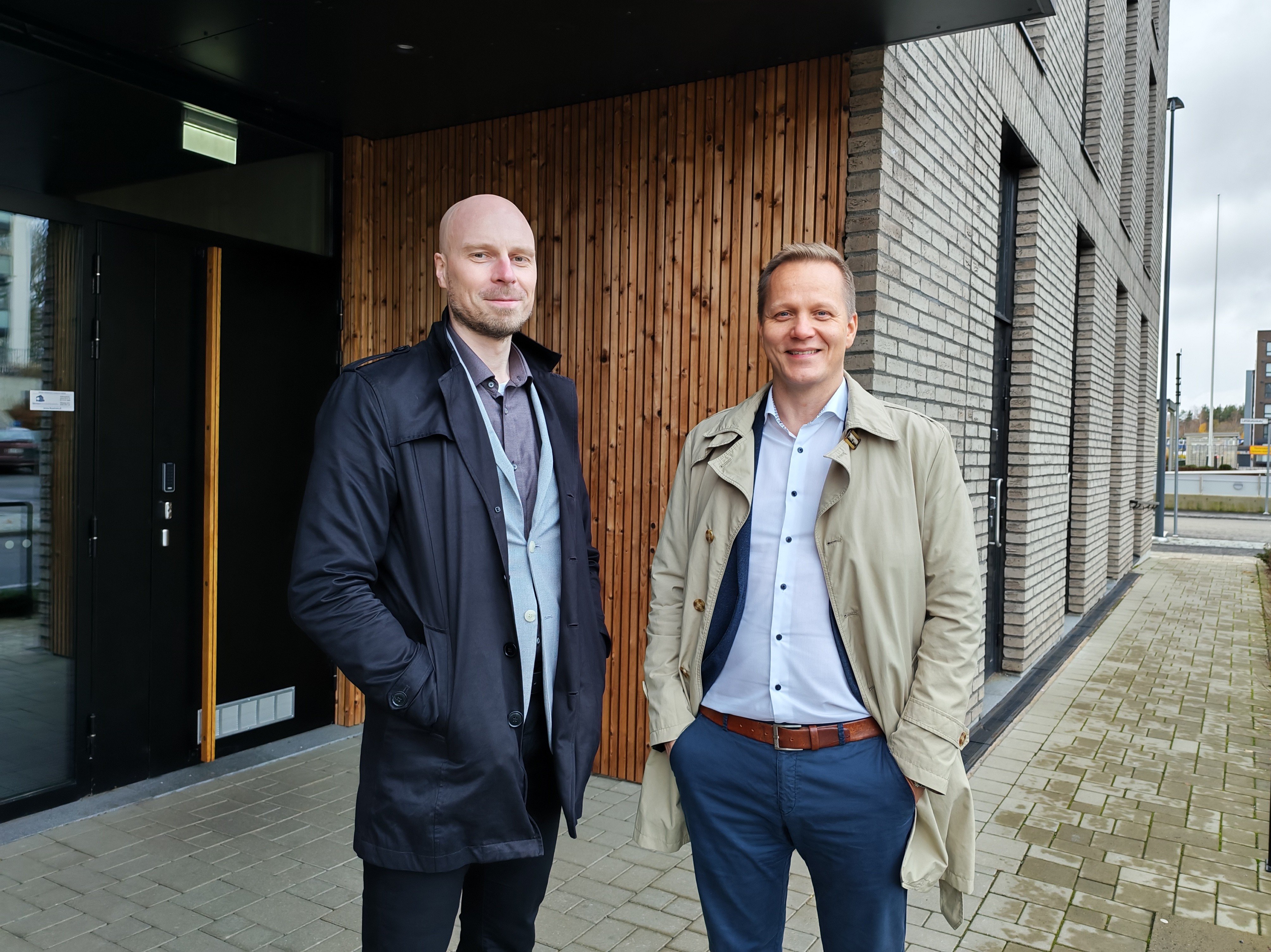 Kuvassa OP Pirkanmaan asiakkuusjohtaja Jaakko Aho (vas.) ja Asuvan toimitusjohtaja Ville Kaseva. Taustalla näkyy Asuvan vuonna 2023 valmistunut arvotalo Monza Tampereen Härmälänrannassa.