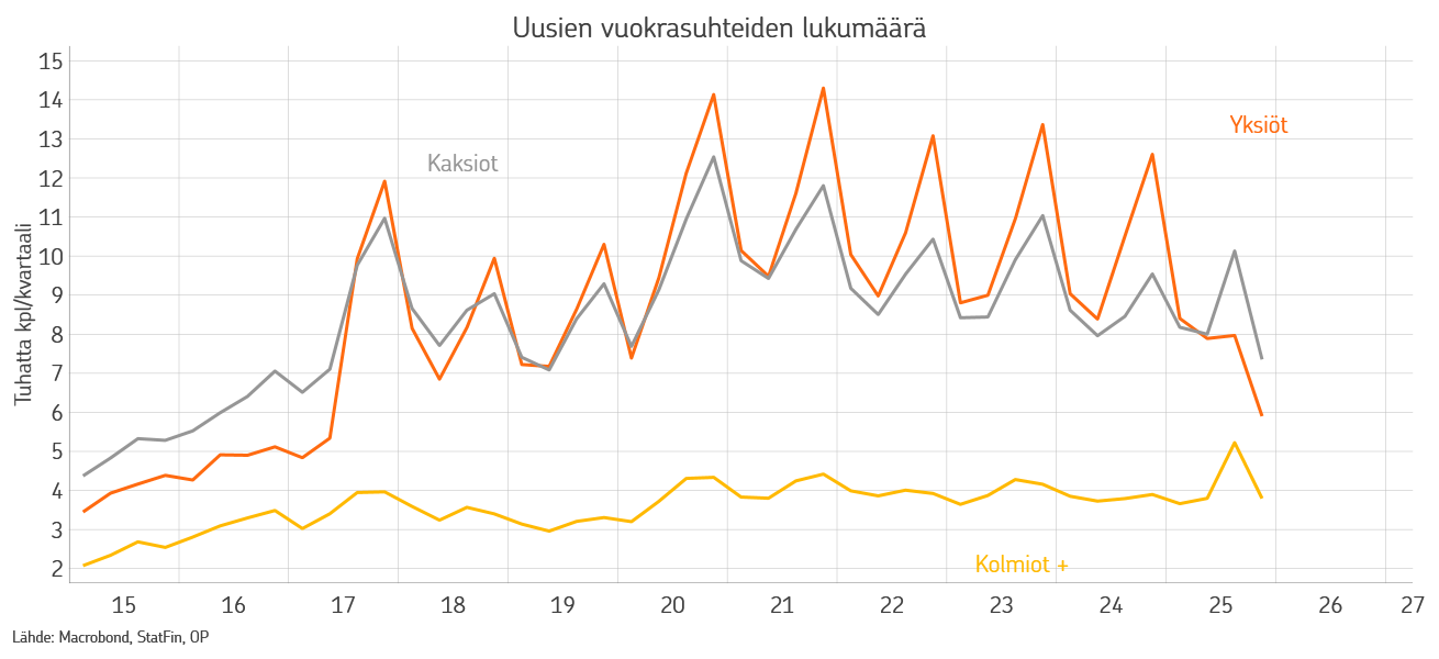 Sen sijaan että yksiöiden vuokrasopimuksia olisi solmittu edellisvuosien tapaan runsaasti, näyttäisi siltä, että viime vuoden lopulla korostui suurempien asuntojen vuokraaminen.