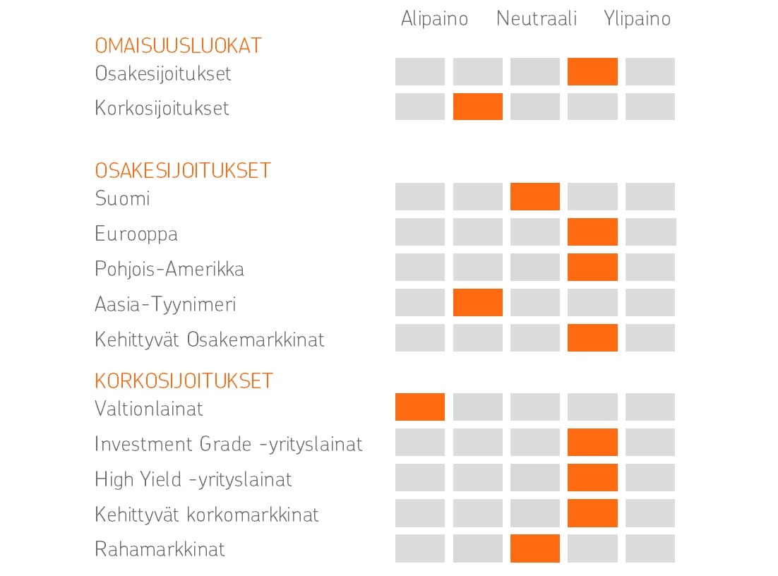 Keskuspankit ja valtiot toimivat ennemmin nousun tukijalkoina kuin jarrumiehinä. Osakemarkkinoista Eurooppa, kehittyvät maat ja Pohjois-Amerikka ovat ylipainossa, kukin omasta syystään.