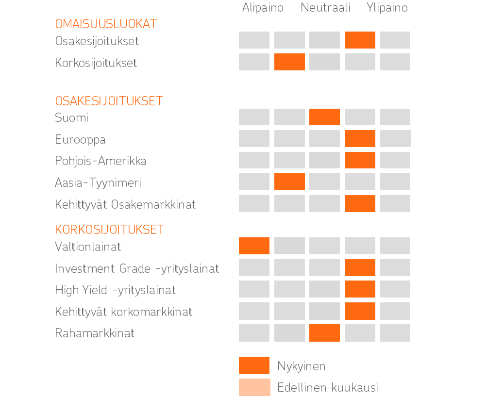 Syksyyn suunnatessa osakkeiden osuutta nostettiin entisestään, mikä onkin kannattanut, kun syksyinen myötätuuli on puhaltanut osakemarkkinoille. Pidämme osakkeet edelleen ylipainossa, sillä osakkeet saavat vuoden lopullakin tukea monesta suunnasta.