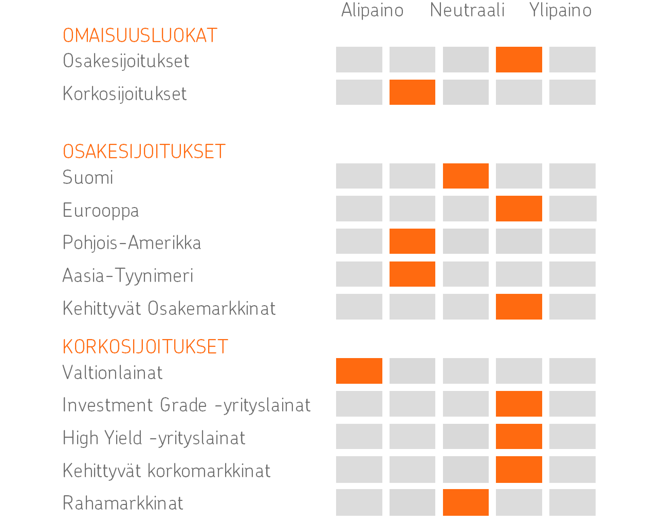Pientä takapakkia niihin voi tulla, mutta taso on edelleenkin lupaava, joten pidämme osakkeet salkuissamme ylipainossa. Samalla kuitenkin hajautamme varat ympäri maailman, jolloin mikään yksittäinen takaisku ei iske liikaa salkkuun.