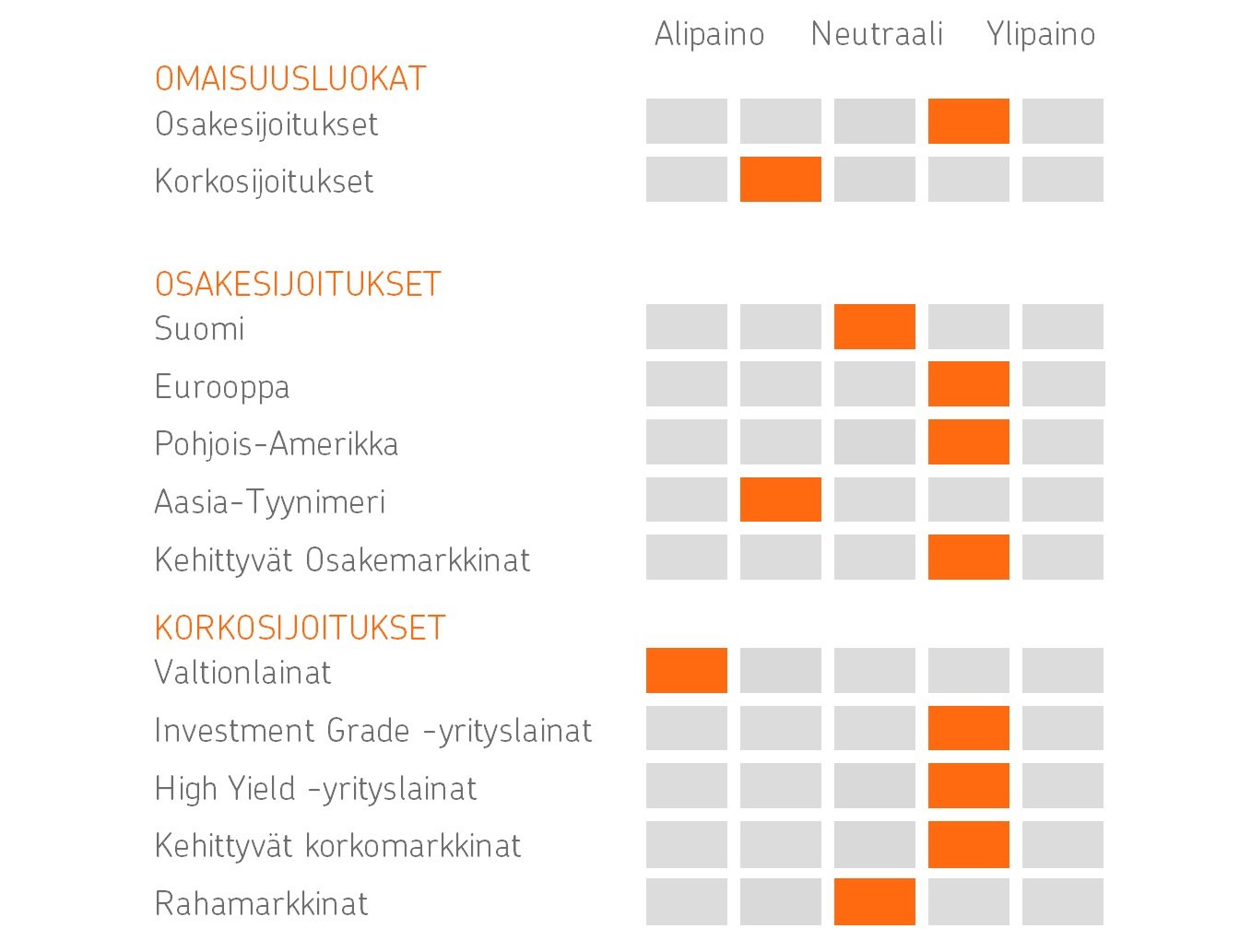 Osakemarkkinoilla haemme lisätuottoja laajasti monilta eri alueilta. Korkosijoituksissa yrityslainat ja voimakkaasti nousseet kehittyvien maiden lainat ovat suosikkejamme.