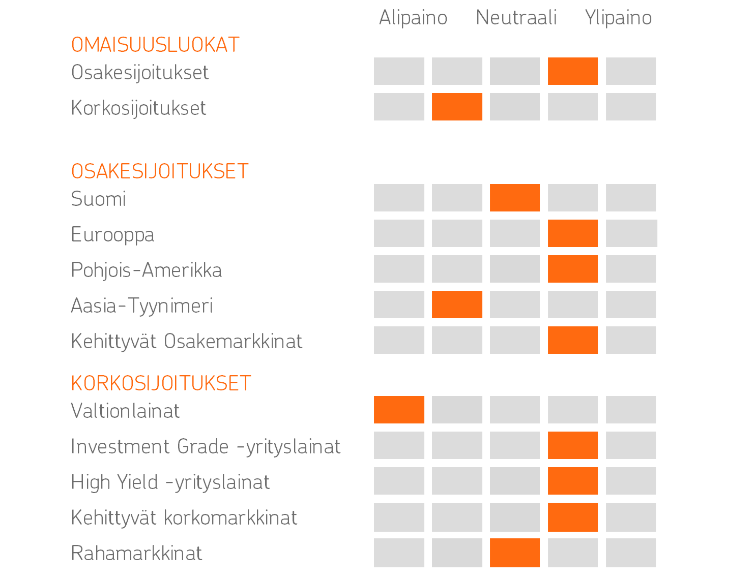 Laaja-alaisesti haetaan mahdollisuuksia myös osakemarkkinoiden sisältä. Siten ylipainotuksia löytyy eri alueilta.