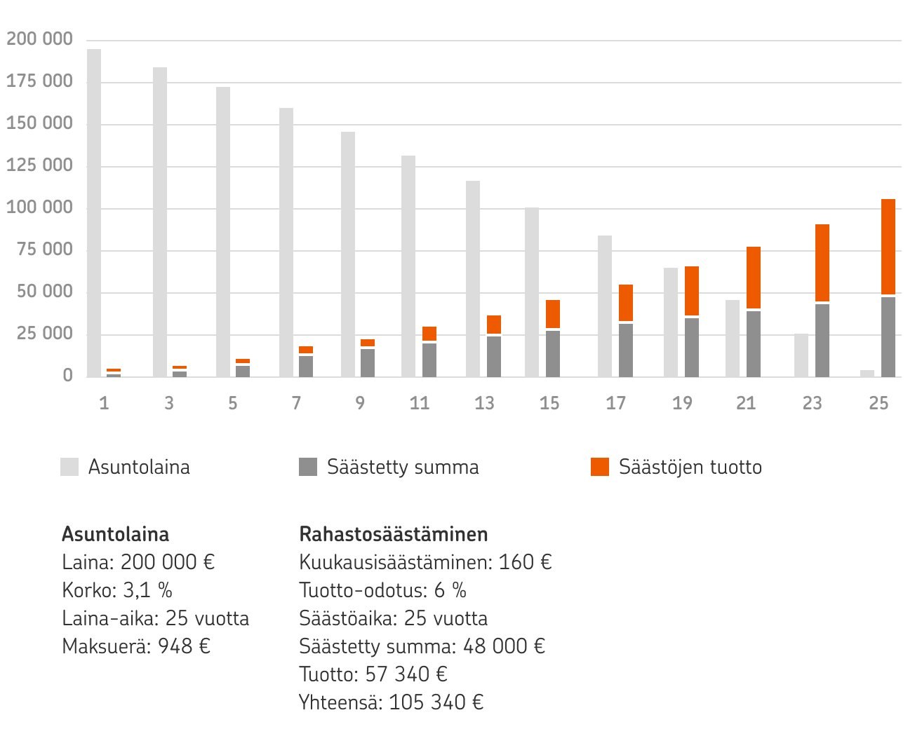 Ensimmäisessä esimerkissä henkilö säästää lainan maksun ohella kuukausittain rahastoon. Lainan maksuerä on kuukaudessa 1148 euroa ja laina-aika on 25 vuotta. Kuukausittain säästöön menee 152 euroa, ja säästöaika on yhtäläinen lainan kanssa, eli 25 vuotta.
