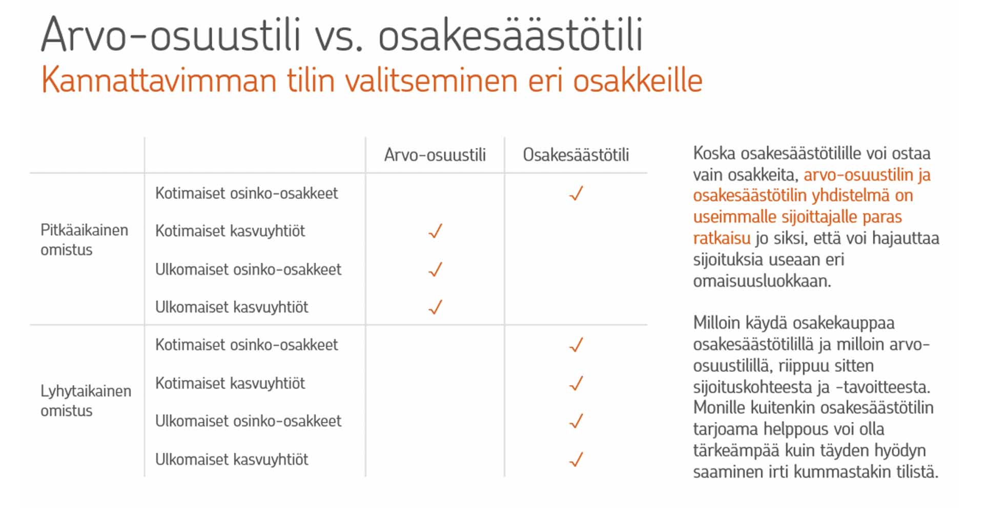 Pitkäjänteinen sijoittaja voi huoletta säilyttää arvo-osuustilillä niin kotimaisia kuin ulkomaisia osakkeita. Osakesäästötilille kannattaa verotuksellisista syistä ostaa vain kotimaisia osakkeita, erityisesti osinko-osakkeita.