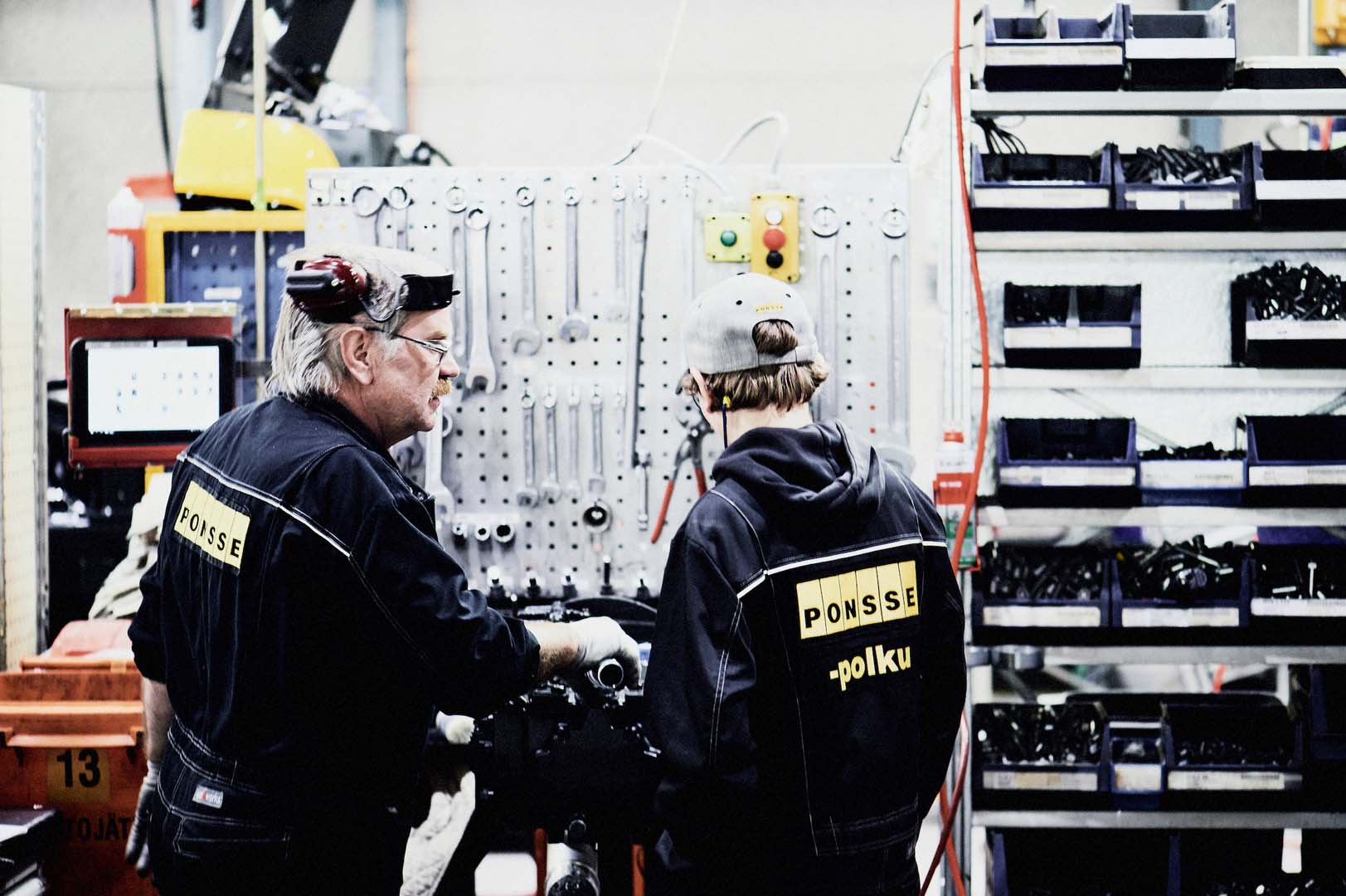 Nuorukaiset eivät kuitenkaan ole tehtaan vakituisia työntekijöitä – ainakaan vielä. Se näkyy jo haalarin selkämyksestä, jossa lukee keltaisin kirjaimin Ponsse-polku. Kyseessä on Ponsselle räätälöity oma työharjoitteluohjelma, joka on ollut käynnissä vuodesta 2011 saakka.